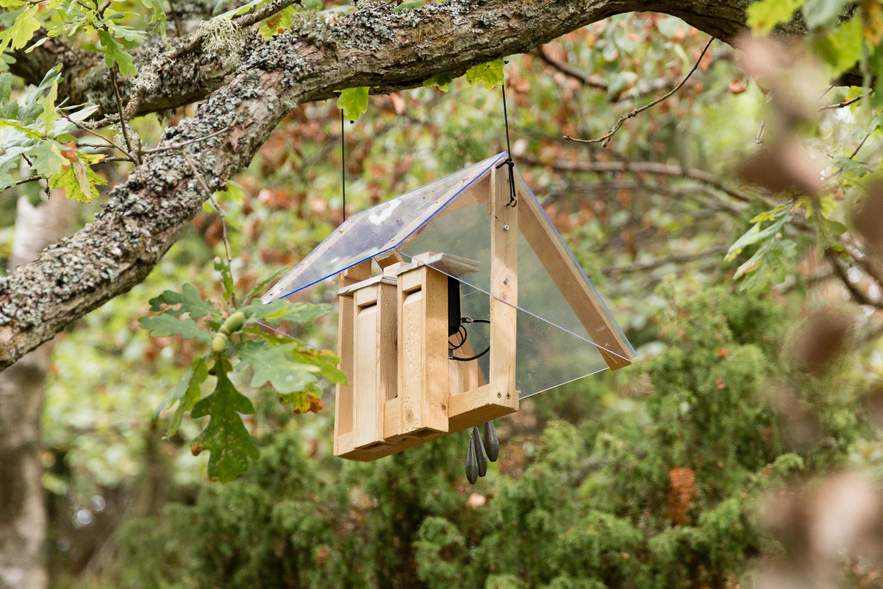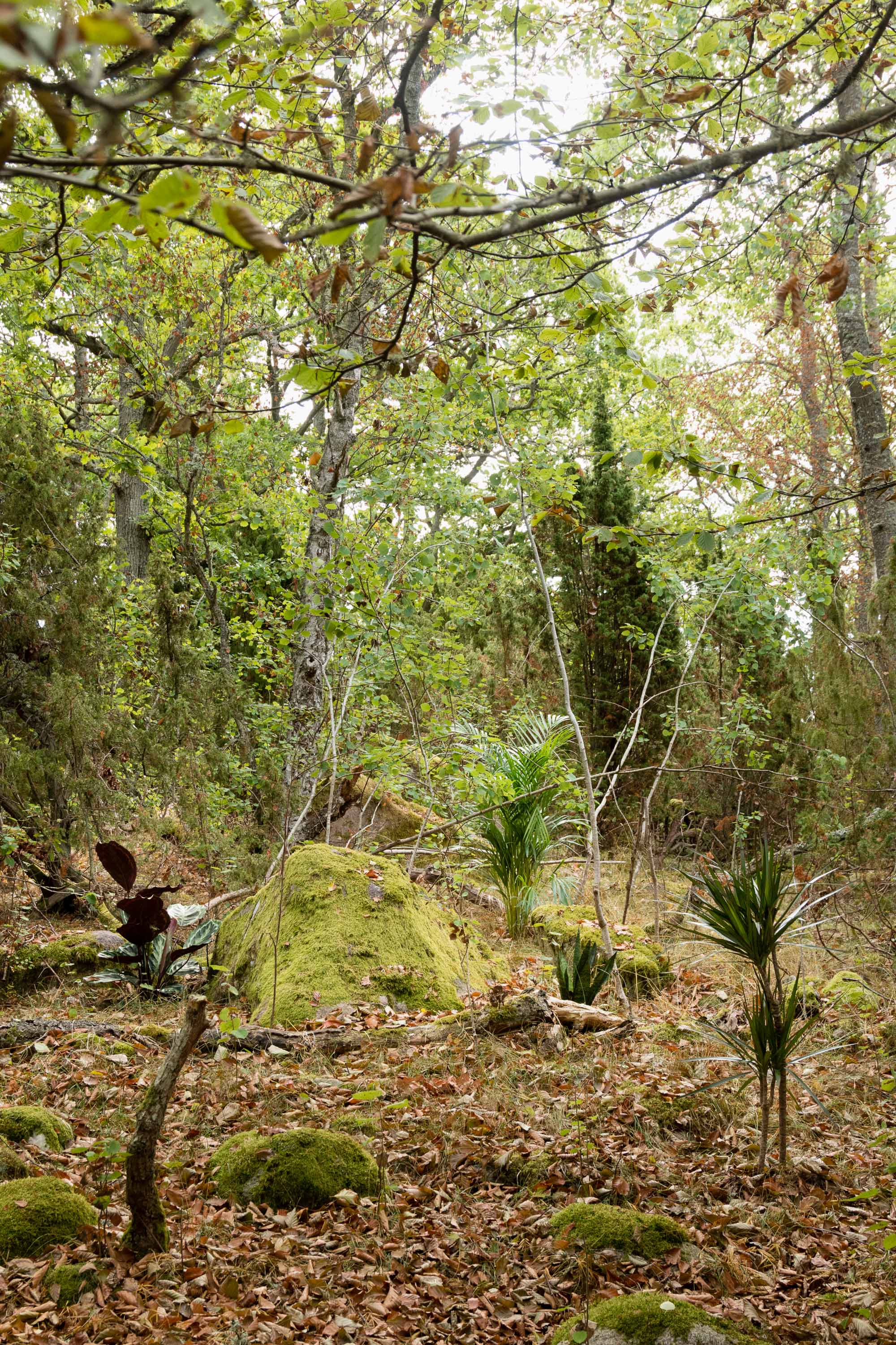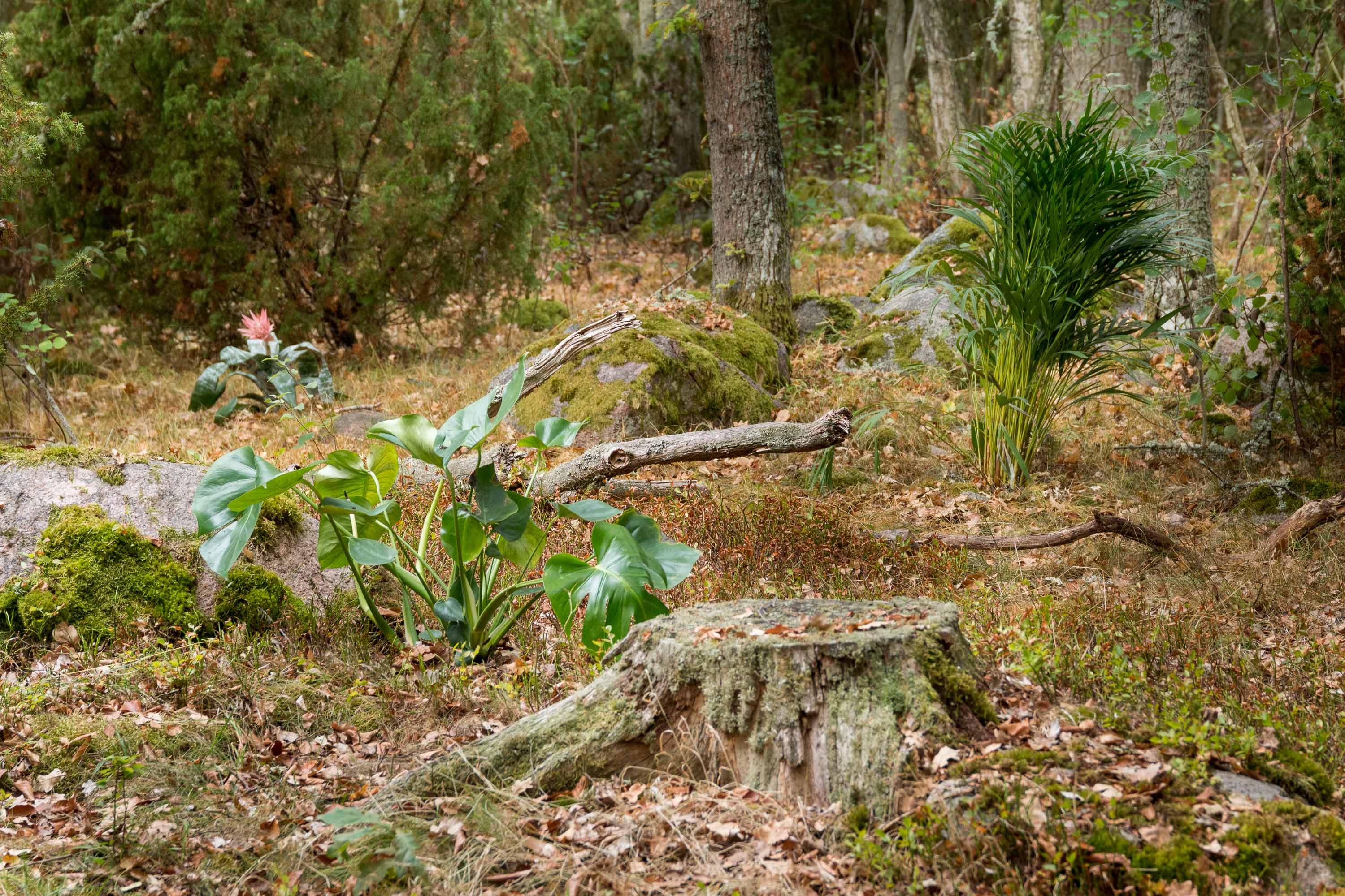 The work "connatural" was realized in Southeast Sweden in summer 2018. It is an intervention in a forest near the coastline. Typical houseplants that are available around the globe were planted on the site. Self made kinetic machines that imitate the bird sounds of woodpeckers and cuckoos were mounted in the trees. This weird combination, where the flora of private spaces is mixed with the sounds of artificial birds and the local vegetation, raises questions about how we define nature and how we perceive our environment.